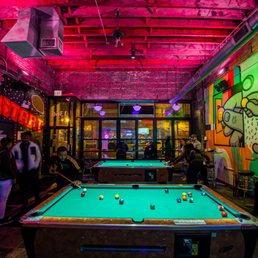 Just popped in because the logo looked cool while walking, but I think this is a cute little date spot to check out esp on a Monday since it's FREE POOL all night long! (Also read for funny story) Walked in and it's got the cutest ambiance with pink neon light and spray painted walls with different arcade game characters all over. There were a few long tables available and I saw a cute Photo Booth (in pictures). I asked the bartender for the sweetest cocktail/"drafttails" and got the Rumedy Slushee which was actually very fruity and summer-y. I loved it since it was essentially a cocktail Icee and cooled me down from walking around the city. And I was by myself and some rando started acting up and called me a b-- for not giving him attention. And even held up the chair for a second. But the bartender immediately called for the bouncer and kicked him out. Felt very safe because of her. Definitely will be checking this place out with my bf for game night and pool (specifically on Mondays!) & sending my thanks to the bartender!